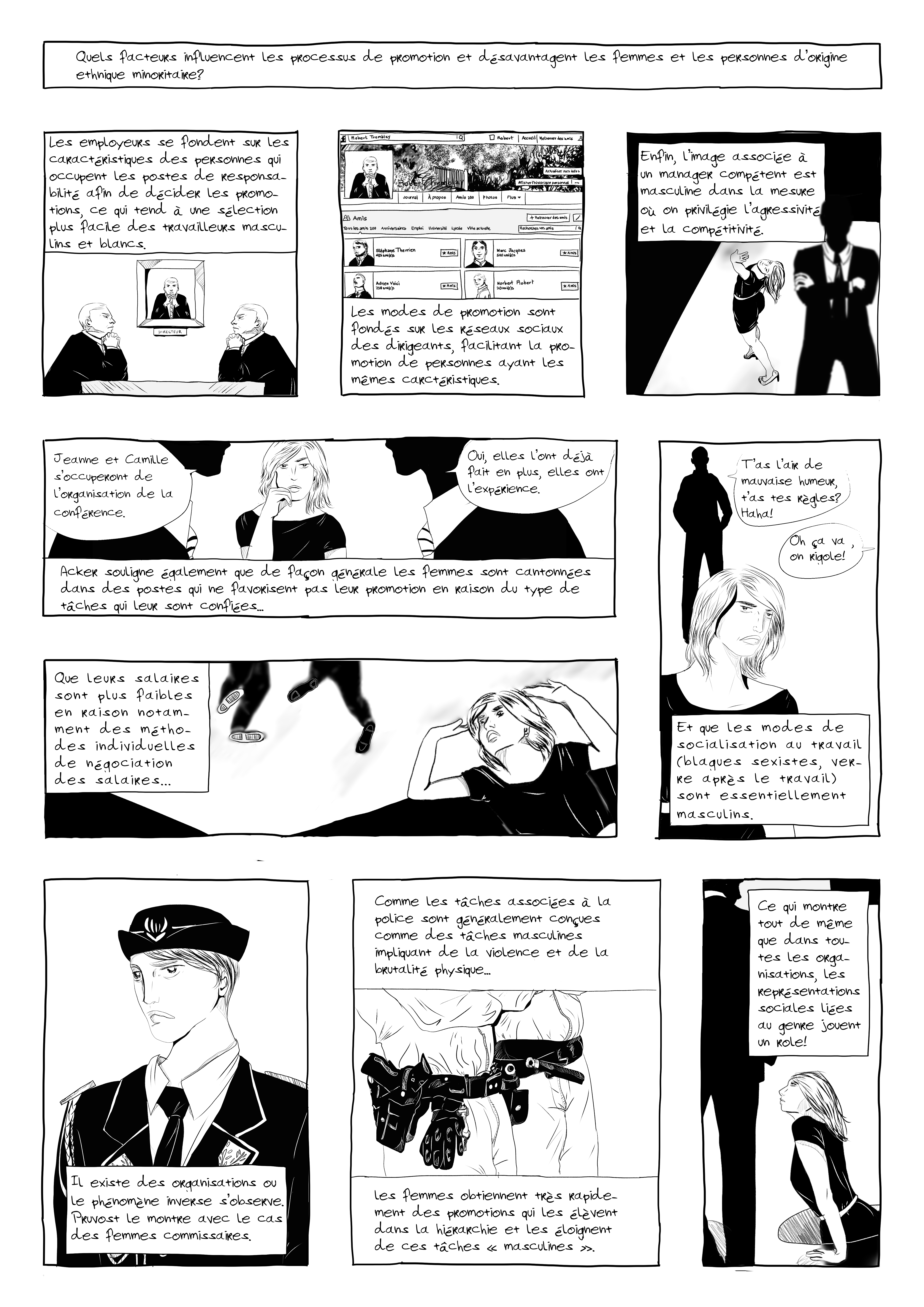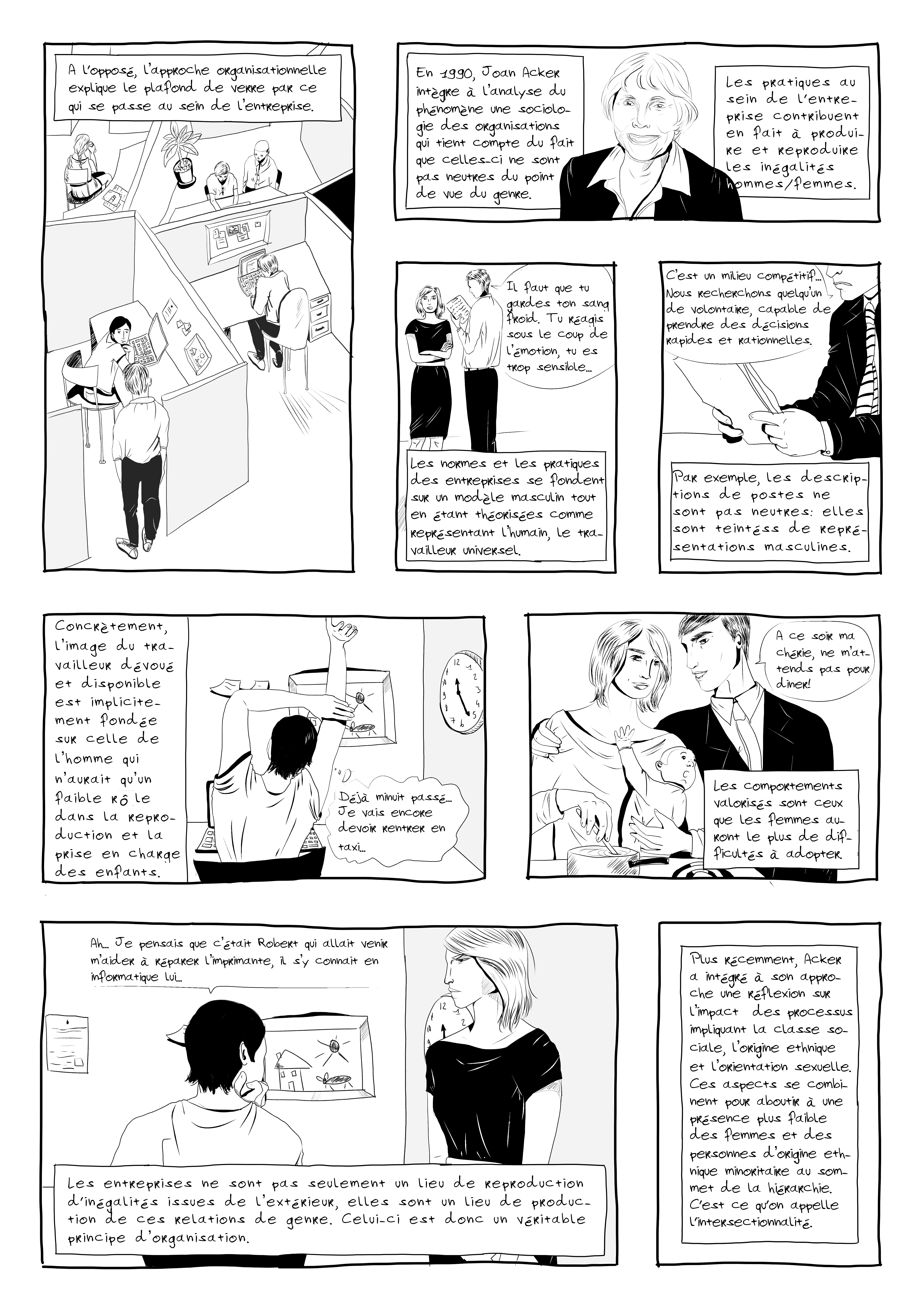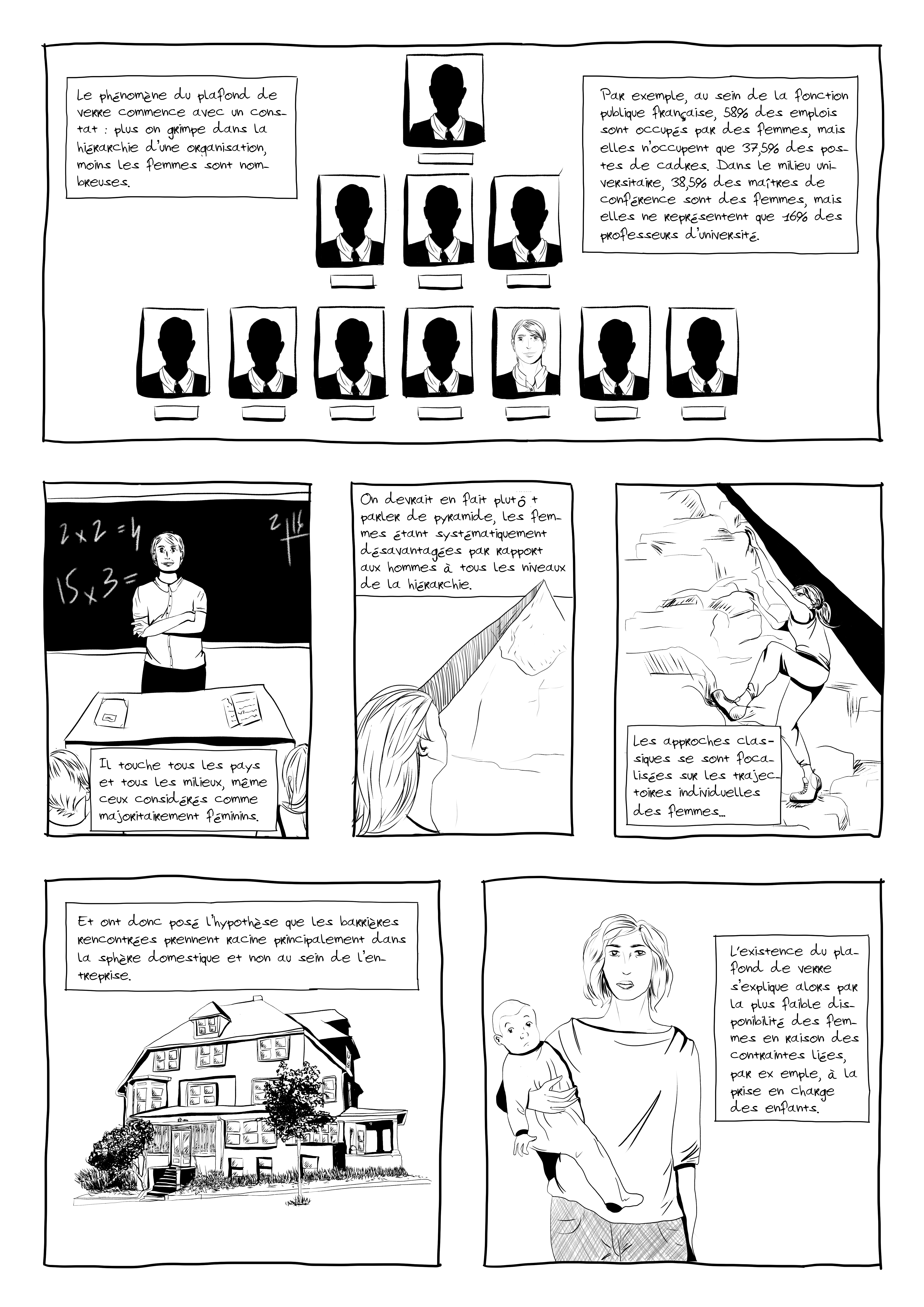 Ça aura mis le temps, mais voilà! Le sujet du jour est le plafond de verre, et comment on peut l’expliquer. J’admet que c’est assez dense…Merci à Camille, qui a fourni le matériel théorique pour réaliser la bd!