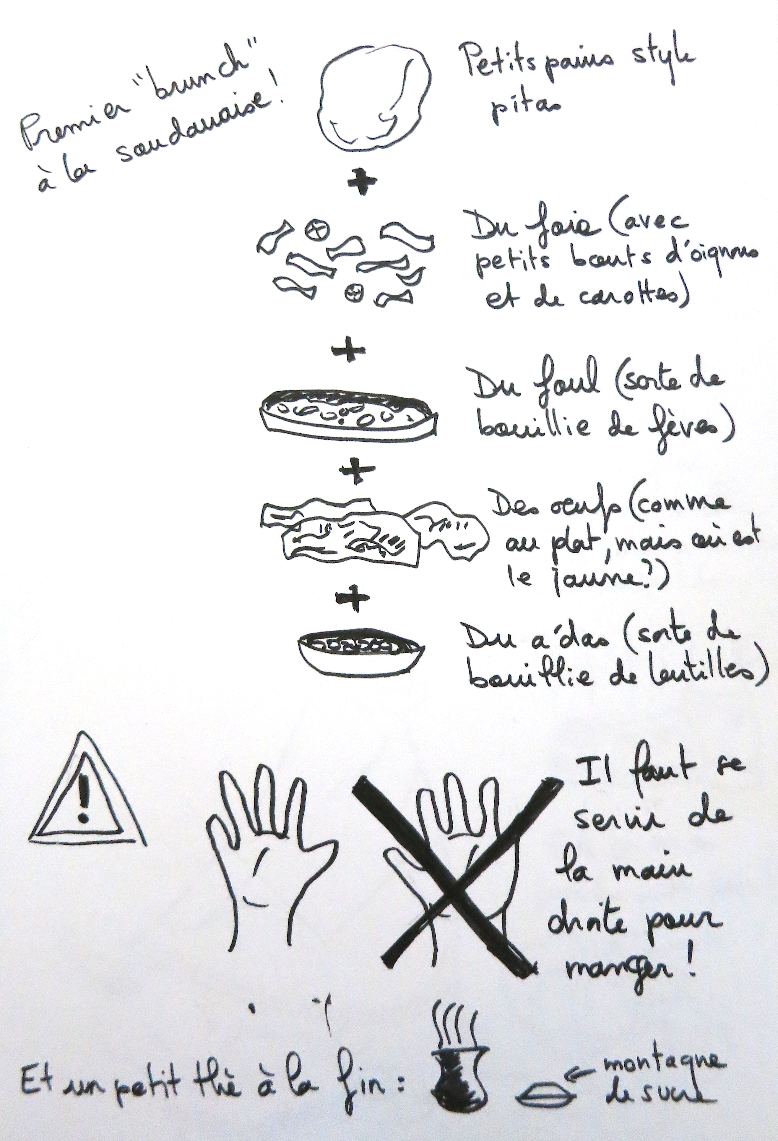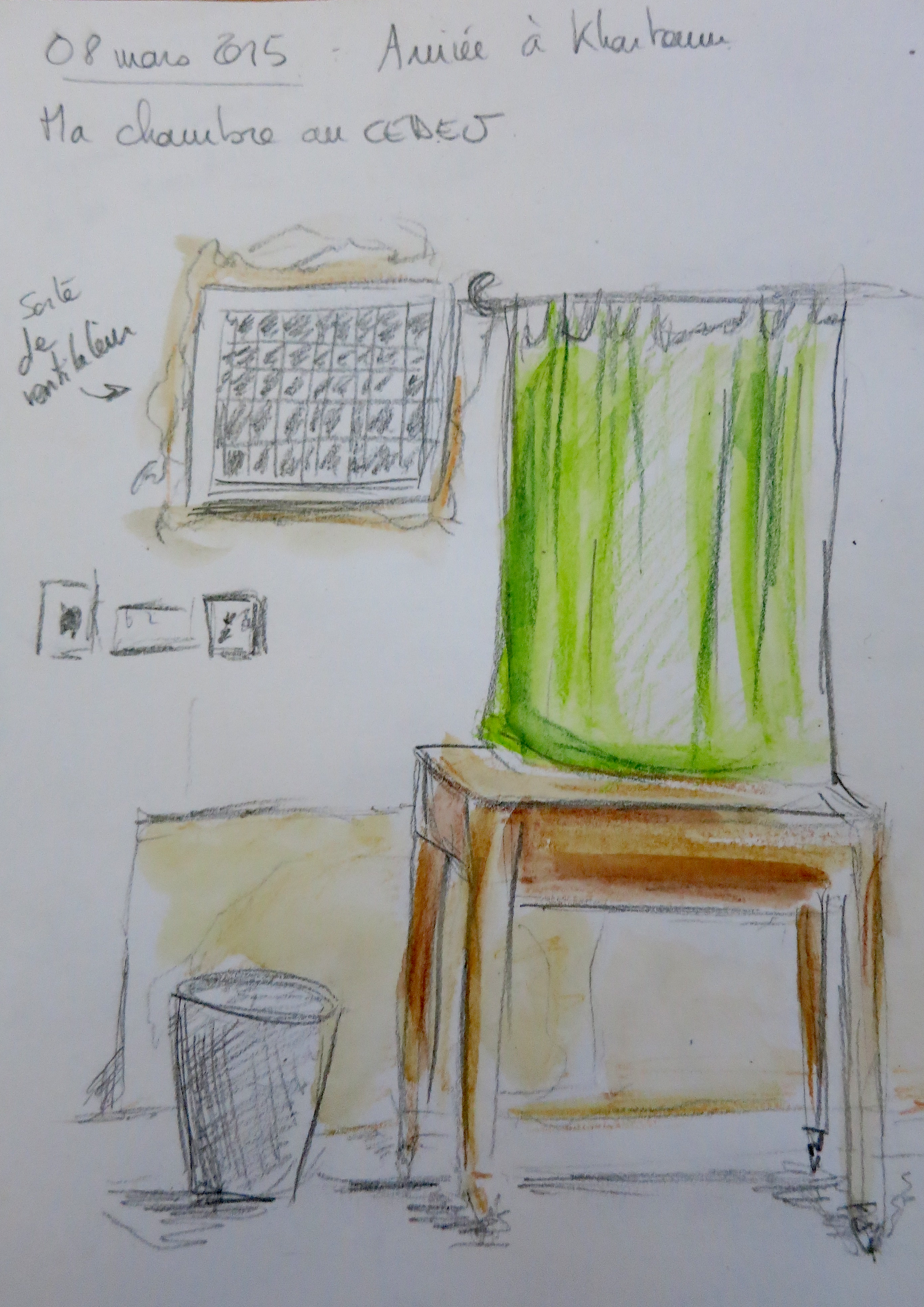 J’espère avoir le temps d’alimenter davantage le blogue (les soirées khartoumoises sont réputées pour leur tranquillité, voire leur inexistence), mais j’ai aussi décidé d’essayer de faire un petit « carnet de terrain » dessiné. L’idée est de vous faire partager mon expérience autant au niveau de la recherche (notez qu’aller « sur le terrain » n’est qu’une méthode parmi d’autres pour récolter des données, mais moi je trouve que c’est plutôt cool même si ça implique un risque de tourista) qu’au niveau de la découverte du Soudan.